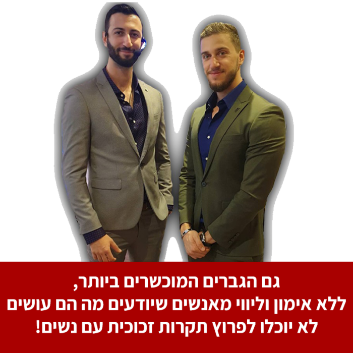 אצלנו תלמד איך להיות גבר חזק וכריזמטי עם ביטחון עצמי אותנטי מברזל (גם אם אתה לא חתיך או עשיר), איך להכיר ולמשוך נשים שאתה מעוניין בהן, איך לנהל שיחה זורמת איתן ואיך לדעת מה לעשות שלב אחרי שלב בשיחה איתן כדי להגיע למצבים אינטימיים וזוגיות.